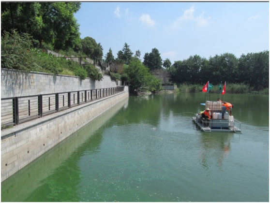 護(hù)城河?xùn)|河藍(lán)藻持續(xù)生長爆發(fā),大量藍(lán)藻聚積在西河入口,隨水而下流入西河,加劇西河藍(lán)藻水華形成,對西河水域造成藍(lán)藻反復(fù)富集現(xiàn)象。