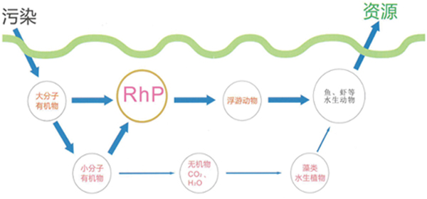 上圖中食物網(wǎng)關(guān)系可知,水體中的污染物首先RhP菌分解、吸收。隨后RhP被浮游動(dòng)物攝食,最終轉(zhuǎn)移到魚蝦等水生動(dòng)物體內(nèi)。也就是說,水體中曾經(jīng)的污染物質(zhì)——氮、磷、鉀等最終成了工程魚身體中的營養(yǎng)物質(zhì)。這就是RhP技術(shù)的神奇之處。