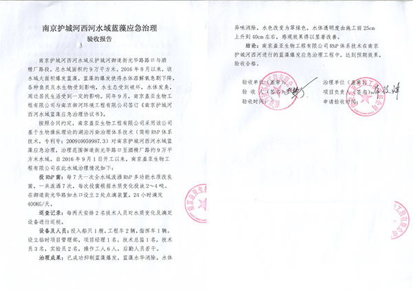南京蓋亞生物工程有限公司運(yùn)用“基于生物操縱理論的湖 泊污染治理”專(zhuān)利技術(shù)(專(zhuān)利號(hào):200910059987.3),先后成功治理數(shù)百個(gè)大、中、小型湖泊、水庫(kù)、河道,積累了豐富的治理經(jīng)驗(yàn),并開(kāi)創(chuàng)了目前國(guó)內(nèi)唯一成功在單體超過(guò)10平方公里水域進(jìn)行水污染治理防止藍(lán)藻暴發(fā)的經(jīng)典案例。該技術(shù)的核心是向污染水體定期投放經(jīng)靶向定位馴化獲取的RhP微生物工程菌株(RhP多功能水質(zhì)改良菌已通過(guò)中國(guó)疾病預(yù)防控制中心急毒試驗(yàn)、藻類(lèi)生長(zhǎng)抑制試驗(yàn),獲農(nóng)業(yè)部生產(chǎn)許可證,不含化學(xué)藥劑),RhP菌以目標(biāo)水域中的氮、磷、硫、碳等為營(yíng)養(yǎng)進(jìn)行增殖,一方面切斷污染耐受力極強(qiáng)、魚(yú)類(lèi)難以消化的藍(lán)藻的營(yíng)養(yǎng)供給;另一方面,快速增殖的RhP菌作為浮游動(dòng)物的食物被消耗,浮游動(dòng)物又被魚(yú)、蝦、貝類(lèi)吞食,從而修復(fù)和重建食物鏈,提高水體自?xún)裟芰?,?shí)現(xiàn)污染資源化。