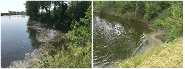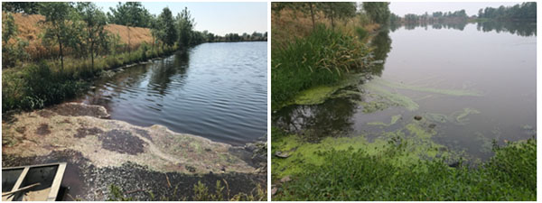 污水塘主要污染為醫(yī)藥化學(xué)污染,水體發(fā)黑,完全沒(méi)有透明度,惡臭熏人,長(zhǎng)約238米,寬約182米,面積約3.3萬(wàn)平方米,平均水深未知,據(jù)介紹為1米左右,底泥較厚;污水通過(guò)西南角污水渠流入水體,污水渠中水色發(fā)黑,透明度約15cm;在南側(cè)偏東位置有一出水閘門(mén),有水流出直接進(jìn)入河道;北側(cè)偏東位置,有一入水閘門(mén),暫關(guān)停。